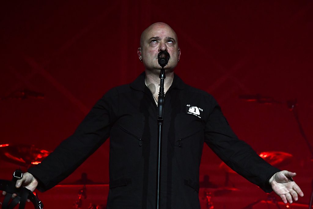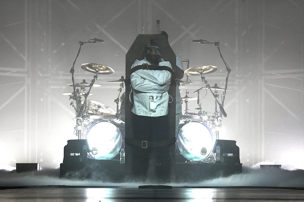 Un grand voile cache la scène. Après Back in time (Huey Lewis and the News), clin d’oeil évident à cette invitation de Disturbed à accompagner le groupe dans un bond dans le temps d’un quart de siècle en arrière, et lorsque les lumières s’éteignent, les musiciens apparaissent en ombres chinoises sur fond de Spread the sickness. Puis, lentement, le rideau se lève, David, tel le Dr Lecter, masqué et en camisole, est attaché sur un diable géant, un garde l’accompagnant au milieu de la scène et le libérant de ses liens. Une tenue noire floquée au dos des lettres bien connues des centres pénitentiaires américains: D.O.C. – pour Depatment Of Correction.