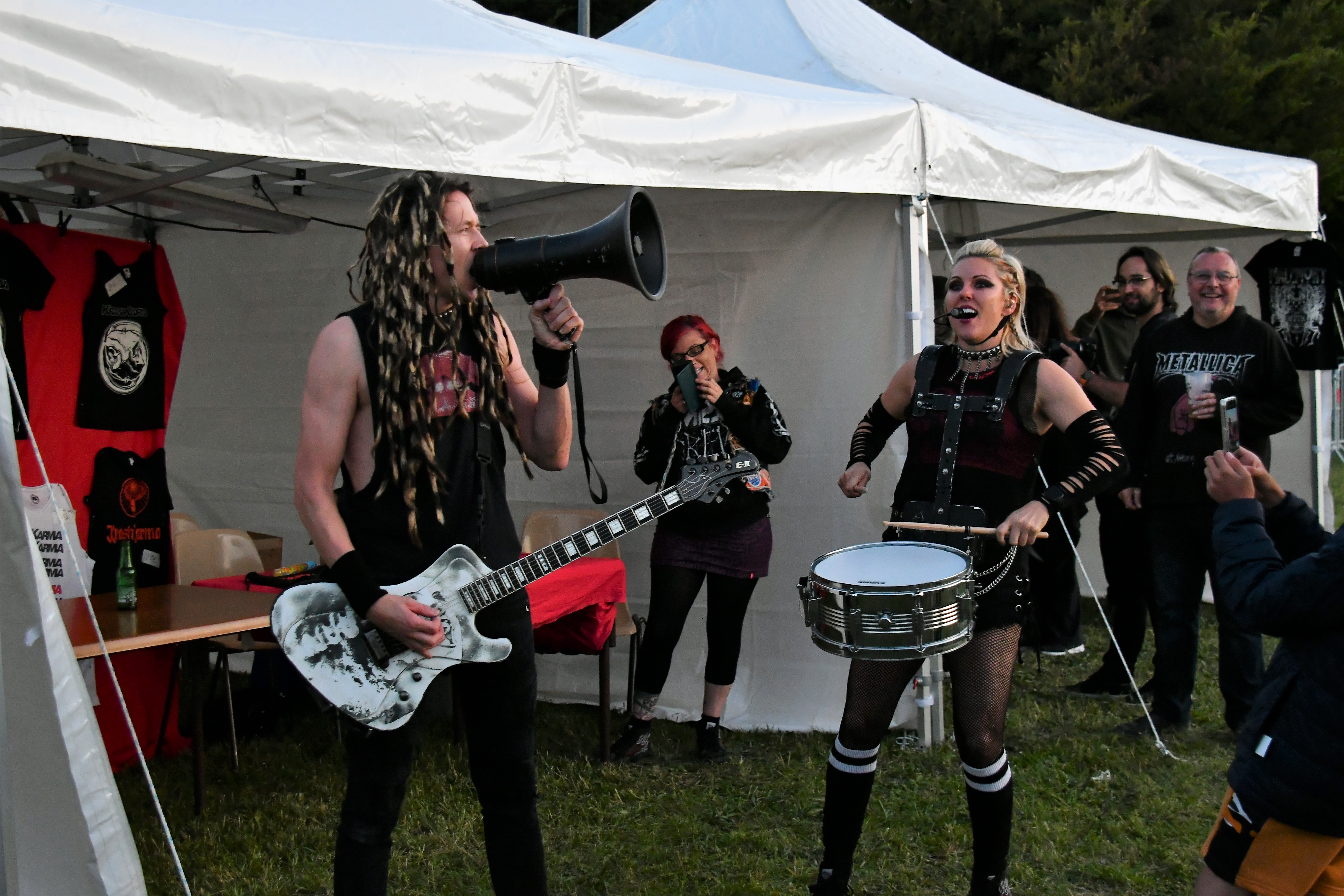 La folie continue de plus belle, Niki s’emparant d’une énorme masse (que pourrait bien jalouser Gloryhammer…) sautant au dessus de son kit pour frapper la terre avec hargne… Le show se termine avec un duo exsangue et ravi qui non seulement vient saluer le public mis l’invite à le rejoindre au stand de merch après le concert. Ce qu’il se passe, le barnum du duo étant quasiment pris d’assaut par les nouveaux fans venus demander autographes et photos autant que se procurer des souvenirs. Un moment exceptionnel – et, encore une fois, un duo à découvrir au travers de cette interview découverte !