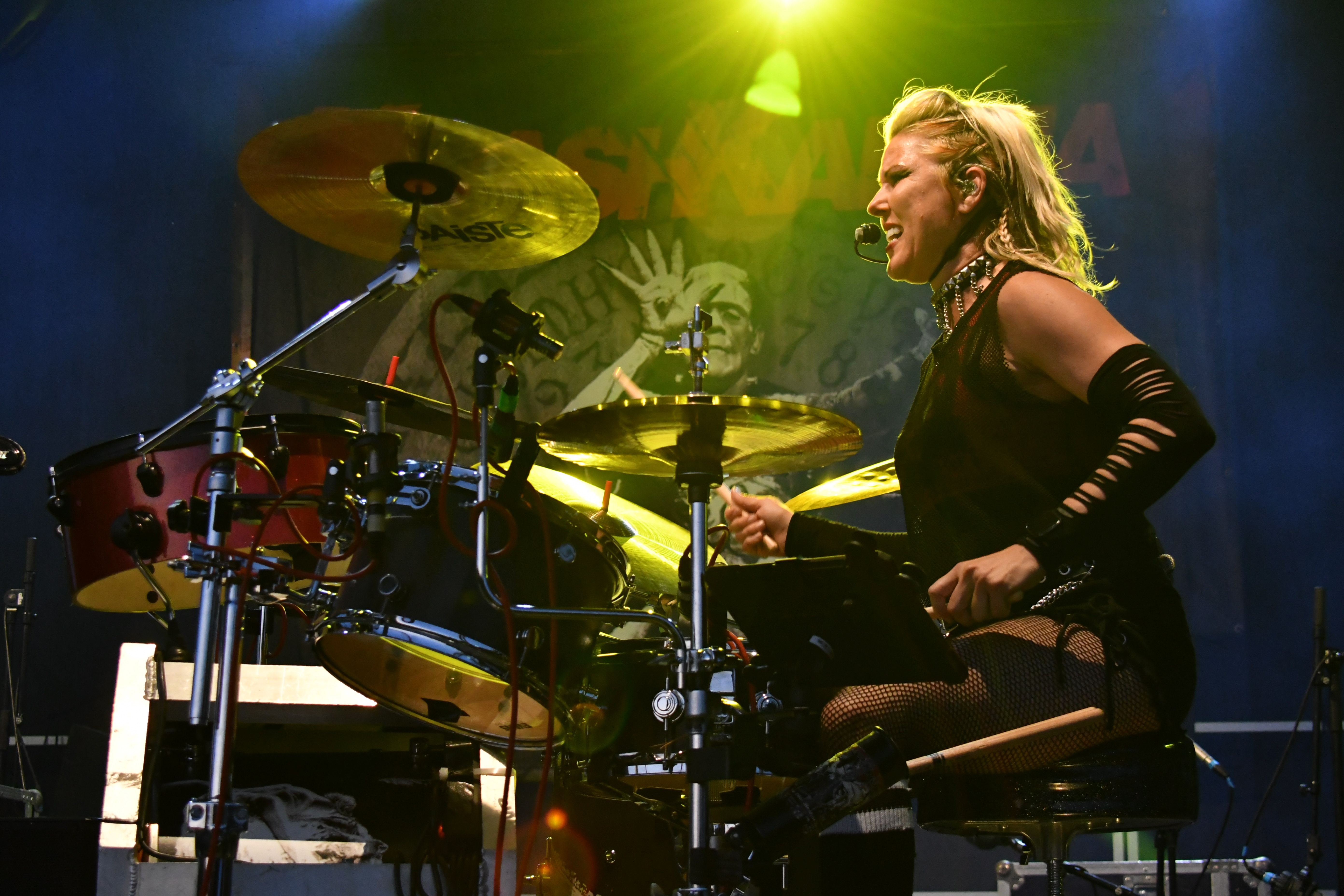 Encore peu connu en France, KrashKarma va se révéler LA sensation du festival. Le groupe m’ayant mis l’eau à la bouche au cours d’une interview quasiment improvisée (je leur ai demandé le matin même et obtenu un OK quasi immédiat, interview à découvrir avec ce lien), impossible de ne pas aller découvrir en live ce duo de L.A. composé de la batteuse chanteuse Niki et du bassiste/guitariste (tout ensemble, oui)/hurleur, Ralf. Un duo « belle et la bête » dont on ne sait pas vraiment qui est la belle et qui est la bête…