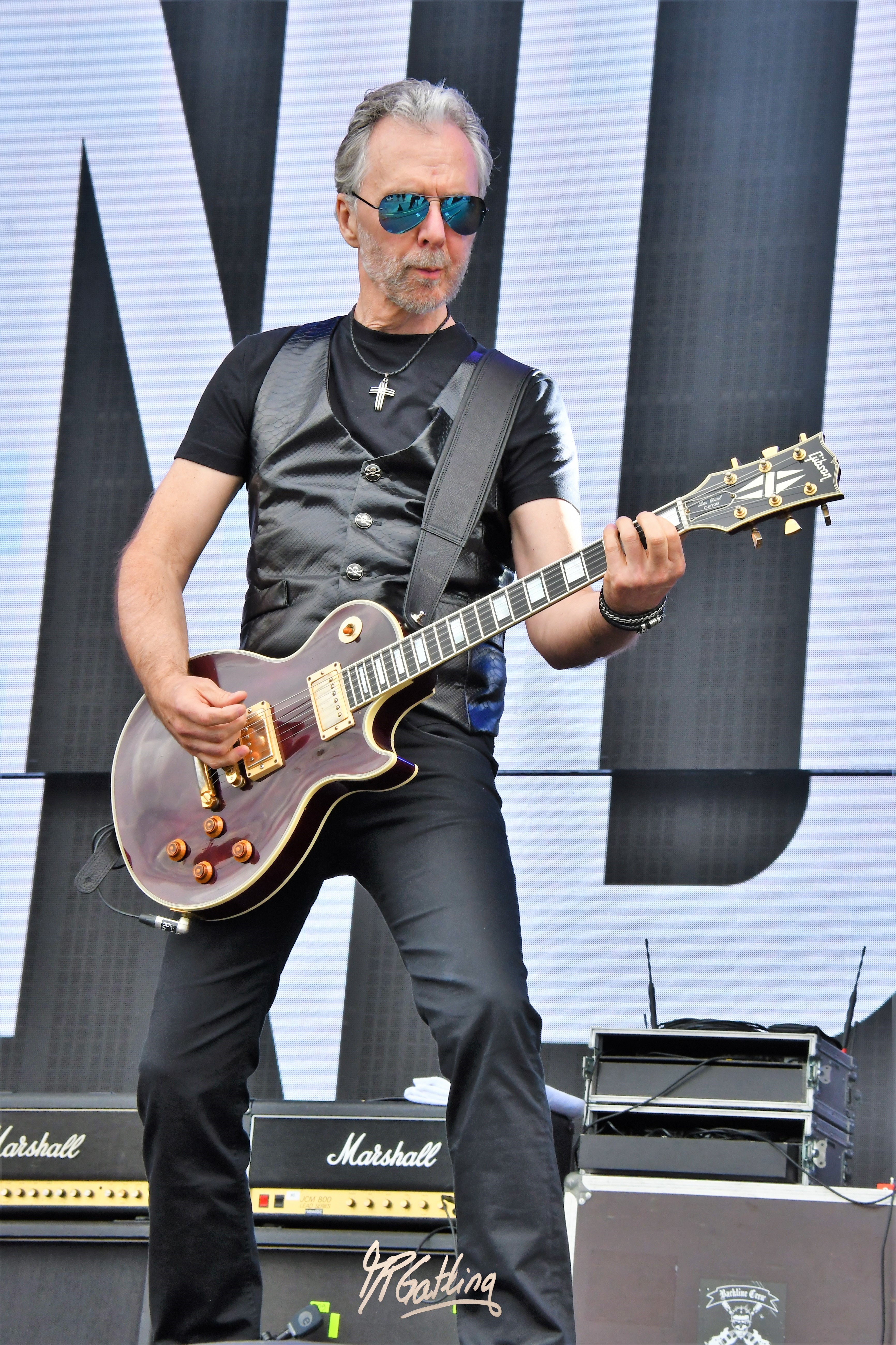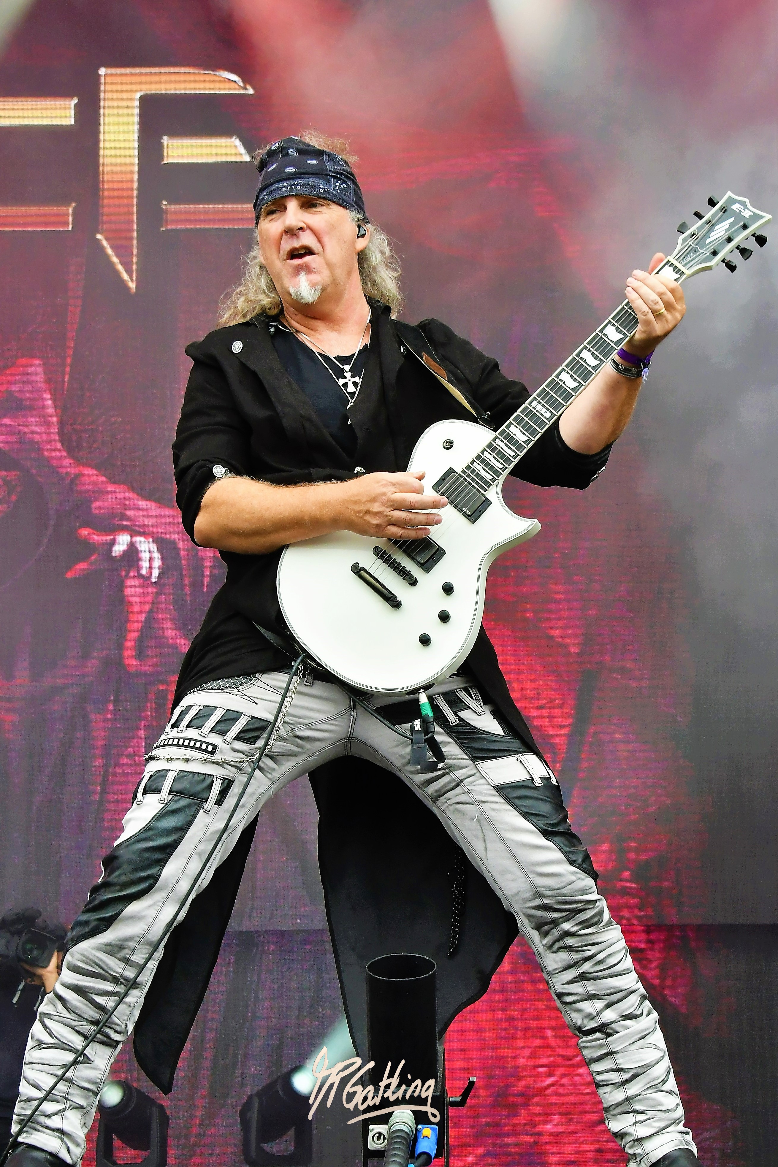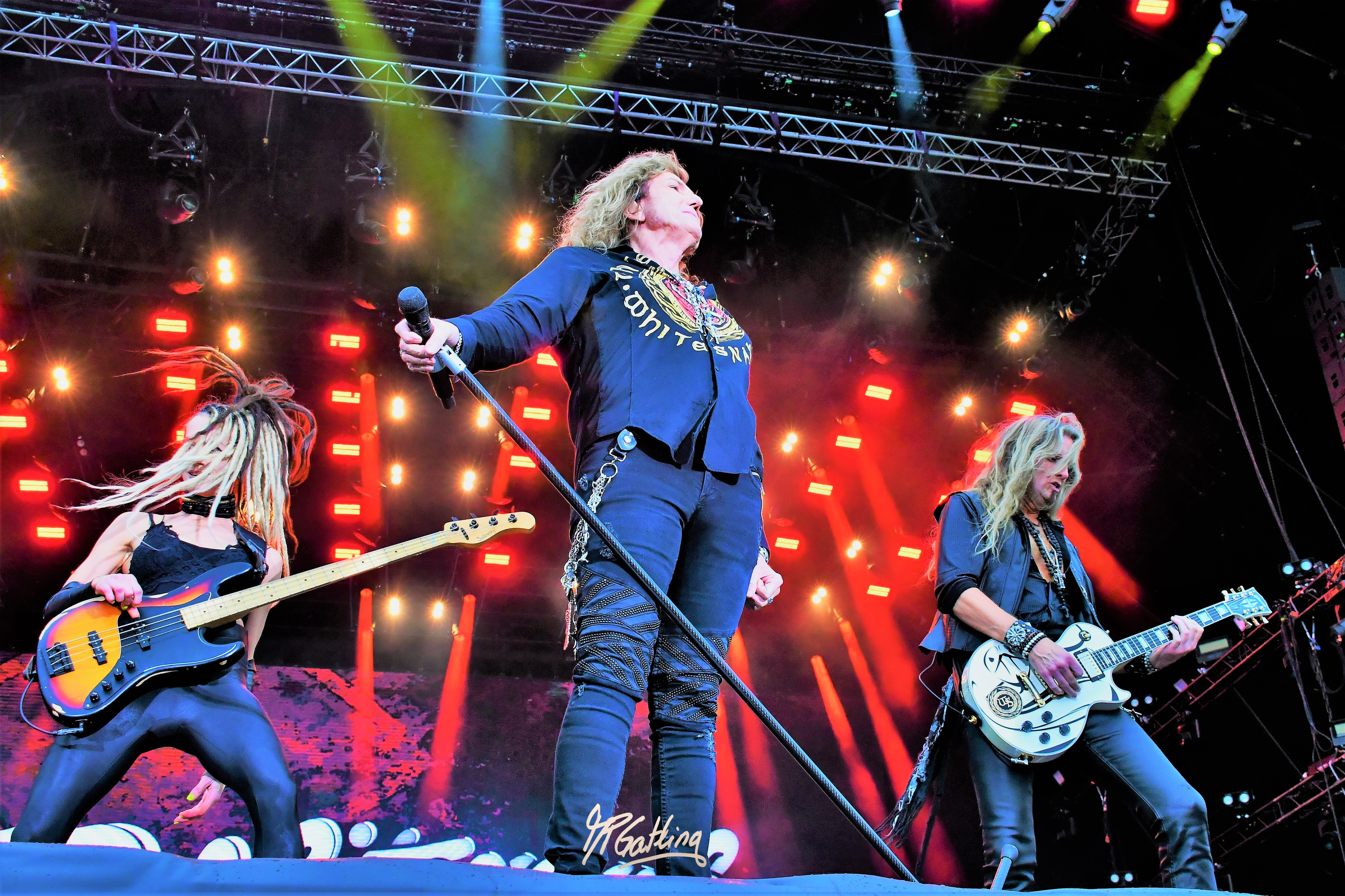 Son ancien boss, David Coverdale, déboule avec son Whitesnake que je n’ai pas vu depuis… pfiou… Et si la pêche est là, le constat est malheureusement sans équivoque : le chanteur a vraiment perdu sa voix, incapable de tenir longtemps une note sans le soutien de ses musiciens qui prennent dès que possible le relais. Coverdale est tout sourire, heureux d’être là, et, avant de démarrer l’incalculable nombre de « fuck » dans ses interventions – il est plus aisé de compter ses « here’s a song for ya ! » immortalisé depuis Live…in the heart of the city – il s’amuse du fait de la présence de Vai sur la scène d’à côté… « Once a snake, always a snake… » annonce-t-il avec un large sourire bienveillant – et présente sa bassiste, Tanya O’Callaghan, la première femme membre su Snake. Et la bassiste déménage et se donne du plaisir au côté du guitariste Joel Hoekstra. Un show plein de couleurs et de classiques qui se termine avec la venue de – « Once a Snake, always a snake » – Steve Vai (non ? quelle surprise !) sur le final Still of the night. Une voix à la ramasse mais un concert au top.