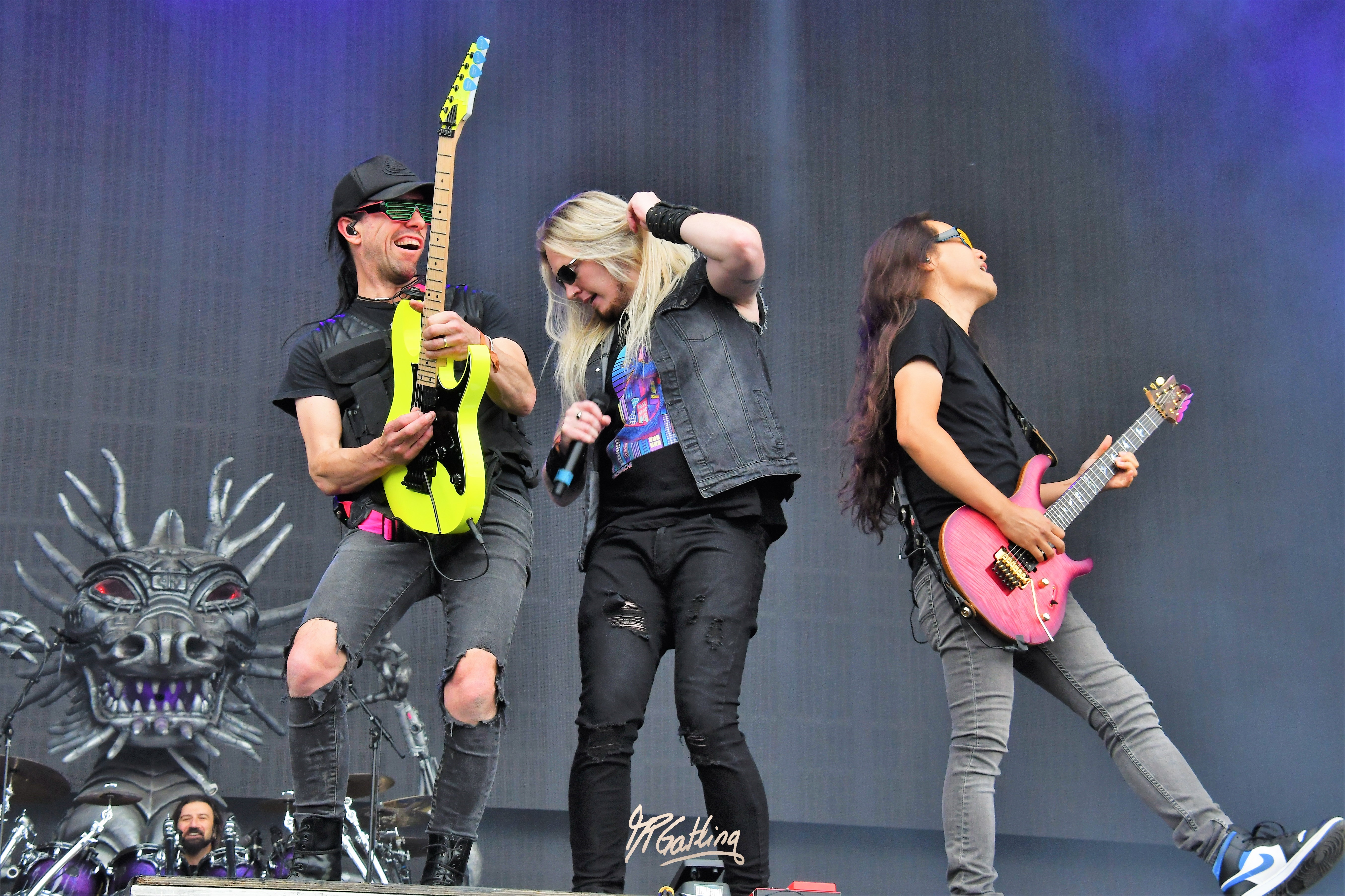 Avec DragonForce, on sait qu’on va avoir droit à un show aussi visuel que technique et quelque peu « frime ». Ceux qui ont assisté à la dernière tournée du groupe retrouvent, en version XXL, un décor de jeux vidéo avec des consoles qui servent de promontoires géants et, naturellement, un dragon en fond de scène. Annoncée en remplacement, la bassiste Alicia Vigil est toujours présente et la complicité avec les autres musiciens, Herman Li et Sam Totman en tête, est réelle. Une place permanente pour elle ? Le groupe est enjoué, alternant entre alignement de notes et tempi plus calmes, toujours avec bonne humeur. La promesse d’un bon moment est tenue.