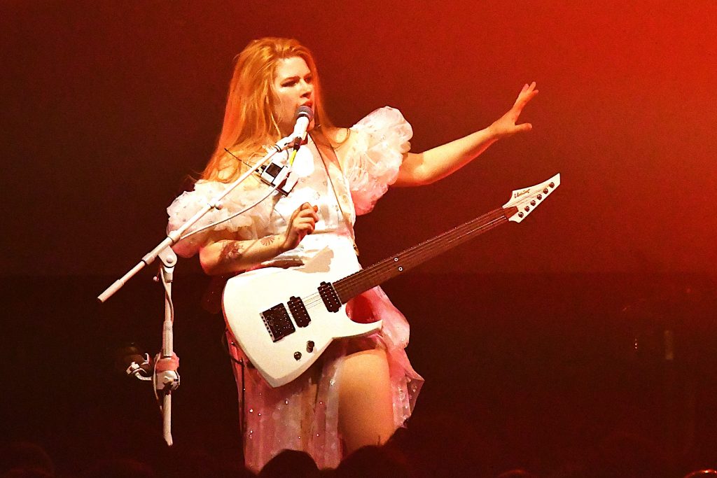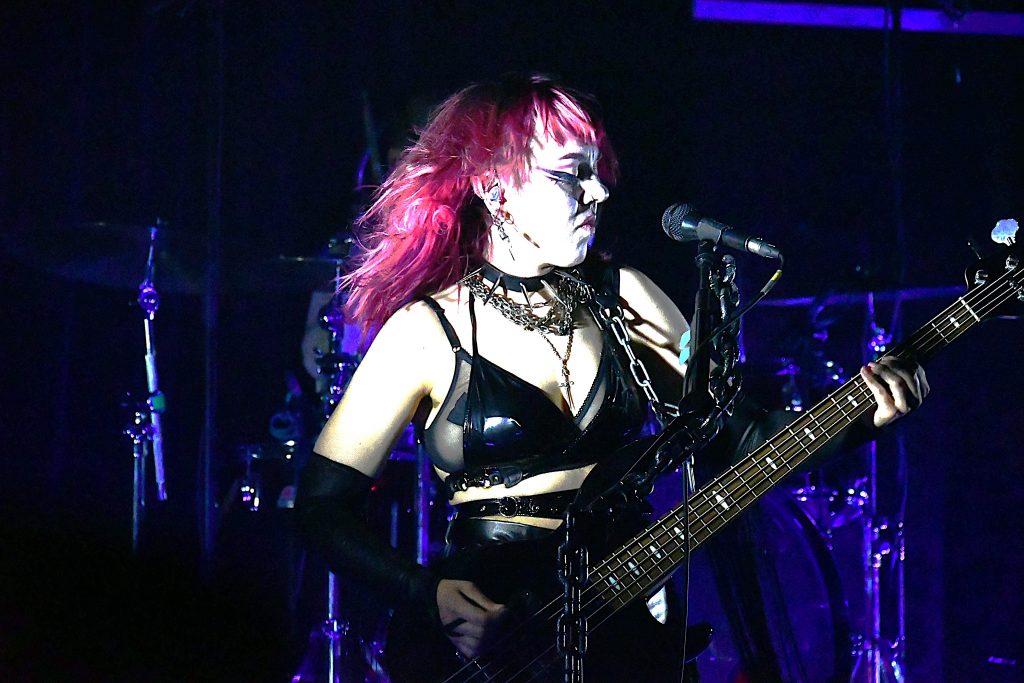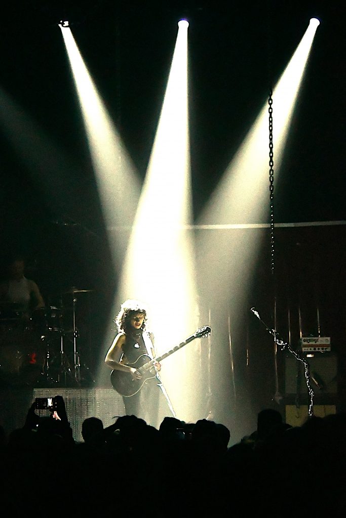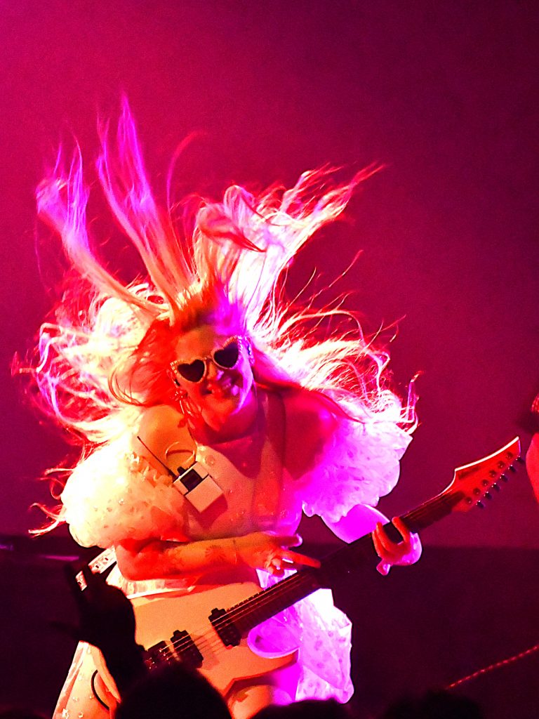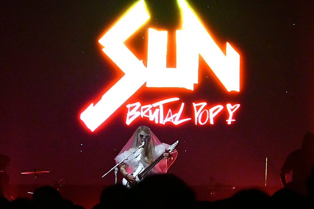 Enter donc Sun qui vient livrer ici sa Brutal Pop. Dès son arrivée, voilée dans sa robe en crinoline, on sent qu’on va vivre un grand moment. Si elle reste quelque peu immobile durant le premier titre, c’est pour mieux se déchainer sur sa guitare et à son micro dès qu’elle tombe voile et lunettes noires. Et là, une heure durant, entre changement de voix radical en un clin d’œil et harangue de la foule, Sun voit rapidement le public lui manger dans la main.