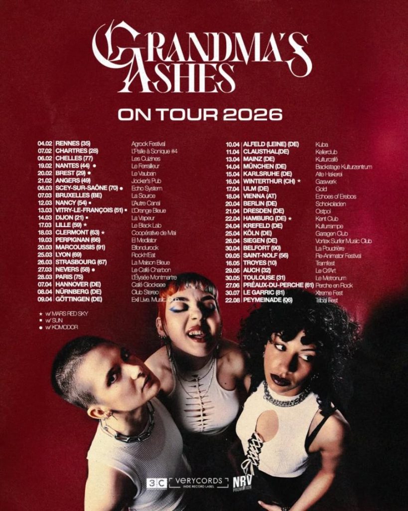 Que de chemin parcouru depuis notre première rencontre il y a trois ans après leur passage au Hellfest! Après une signature chez Verycords et un nouvel album dans la foulée, elles sont retenues pour animer au travers de deux titres la cérémonie des Foudres au Bataclan en 2025 et bien que n’ayant que deux albums à leur actif, les filles de Grandma’s Ashes s’offrent maintenant une vaste tournée en France et ailleurs qui passe par l’Elysée Montmartre parisien. Un pari audacieux mais visblement payant puisque la salle est correctement remplie avec pas loin de 1.000 spectateurs.