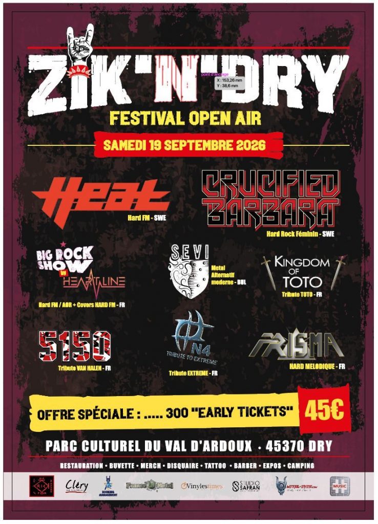 Le Zik ‘N Dry, c’est son nom en clin d’oeil à un certain High ‘n Dry de Def Leppard autant qu’au nom de l’asso ‘Crick for Zik (mais aussi du village de Dry (45)), verra ainsi sa première édition se tenir le 19 septembre prochain sur le site du Parc Culturel du val d’Ardoux à… Dry, justement. Le lieu est habitué aux spectacles puisqu’il reçoit depuis quelques années les sons et lumières retraçant des épisodes de l’histoire de France dans un cadre bien plus qu’agréable.