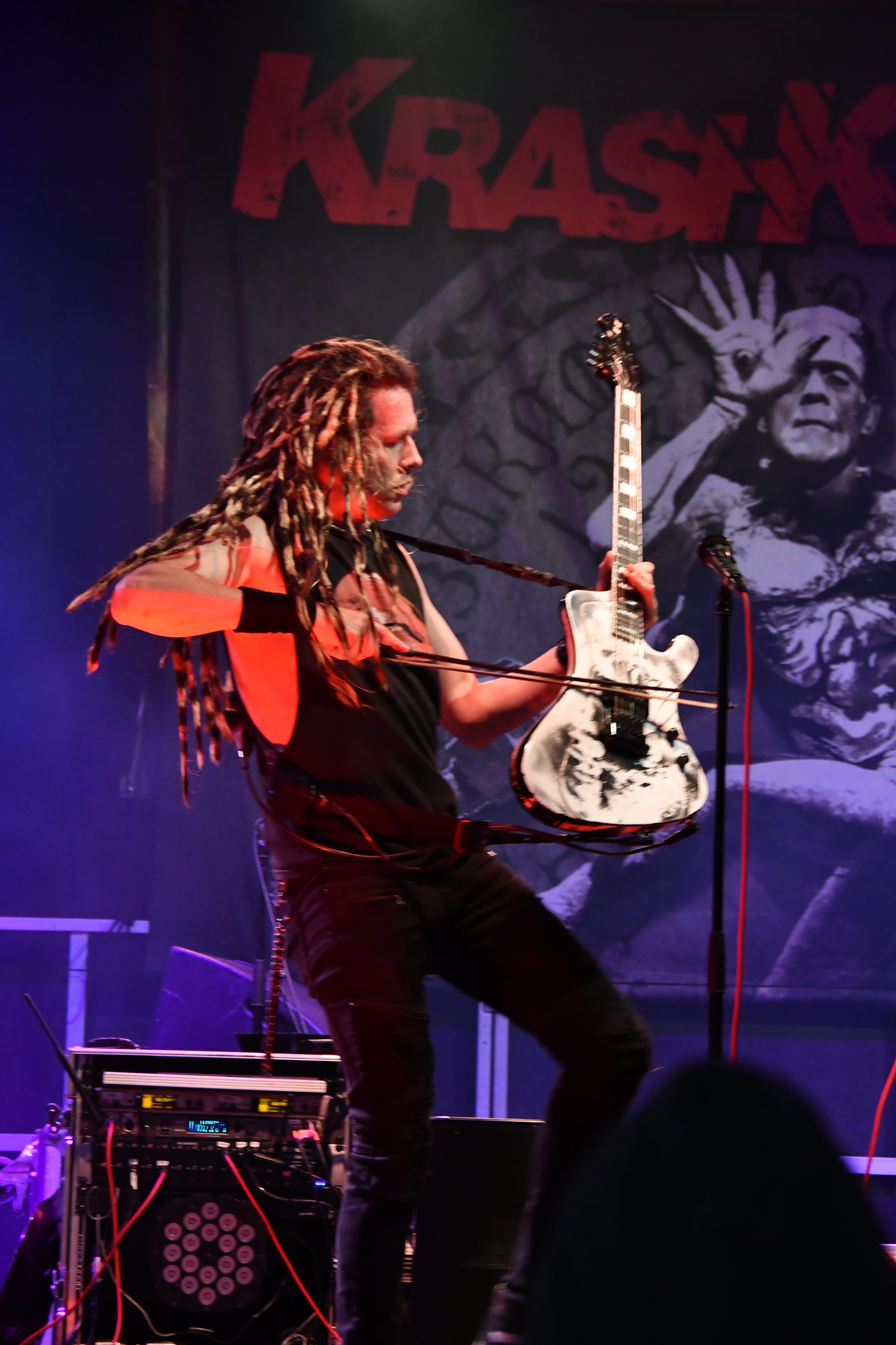 Ralf présente ensuite le duo, précisant que « je suis Krash, elle est Karma ». Le show est à la hauteur des espérances. Tout y passe… Ralf présente au public son instrument fait sur mesure, Mrs Frankenstein: « vous voyez, ici, un switch, là un autre. Le premier c’est pour la guitare (démonstration), l’autre pour la basse (blong blong blong). Et je passe de l’une à l’autre« . Un mini solo lui permet de mettre des sons sur ses propos quand il ne se prend pas pour Jimi Page ou Apocalyptica avec son archet!