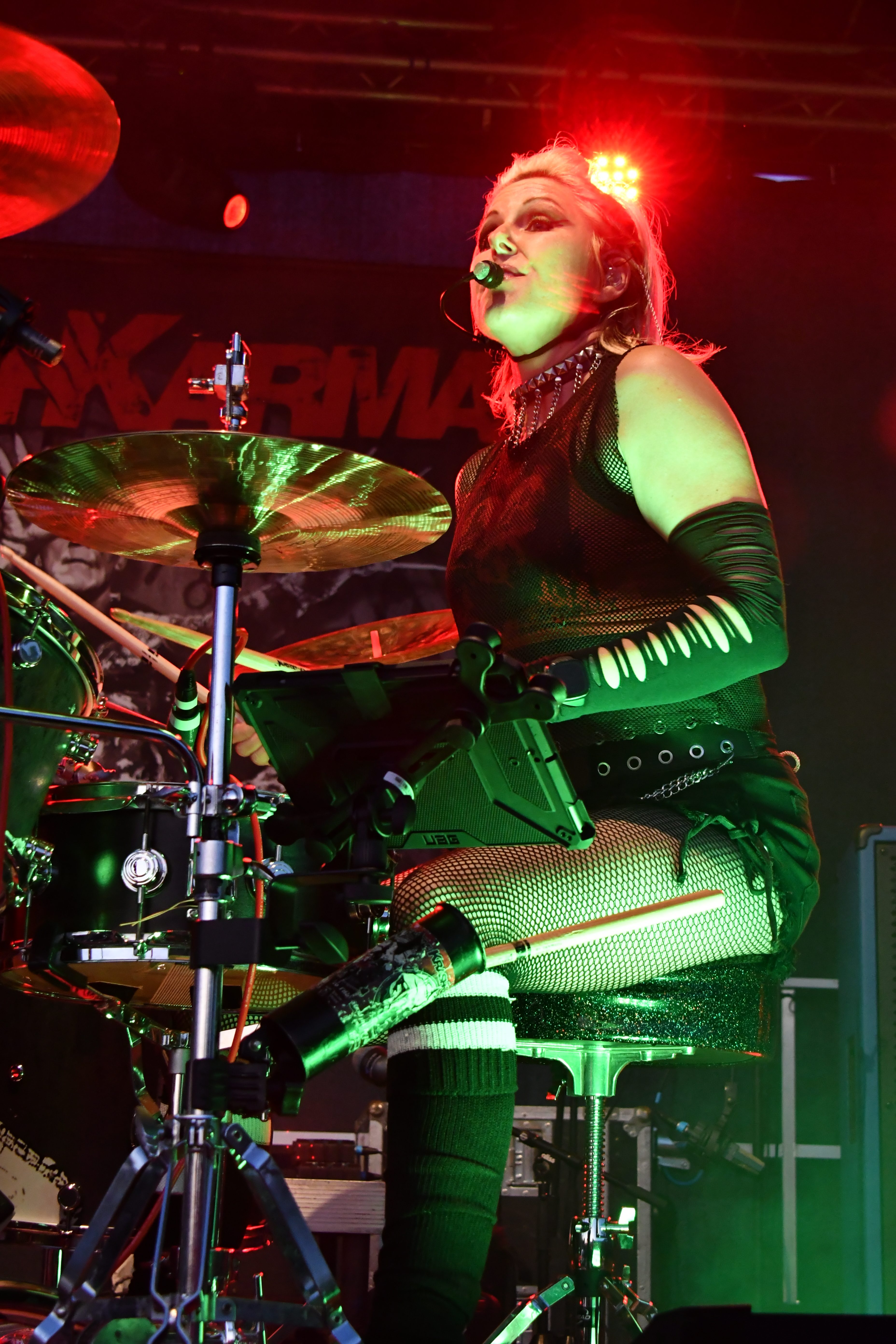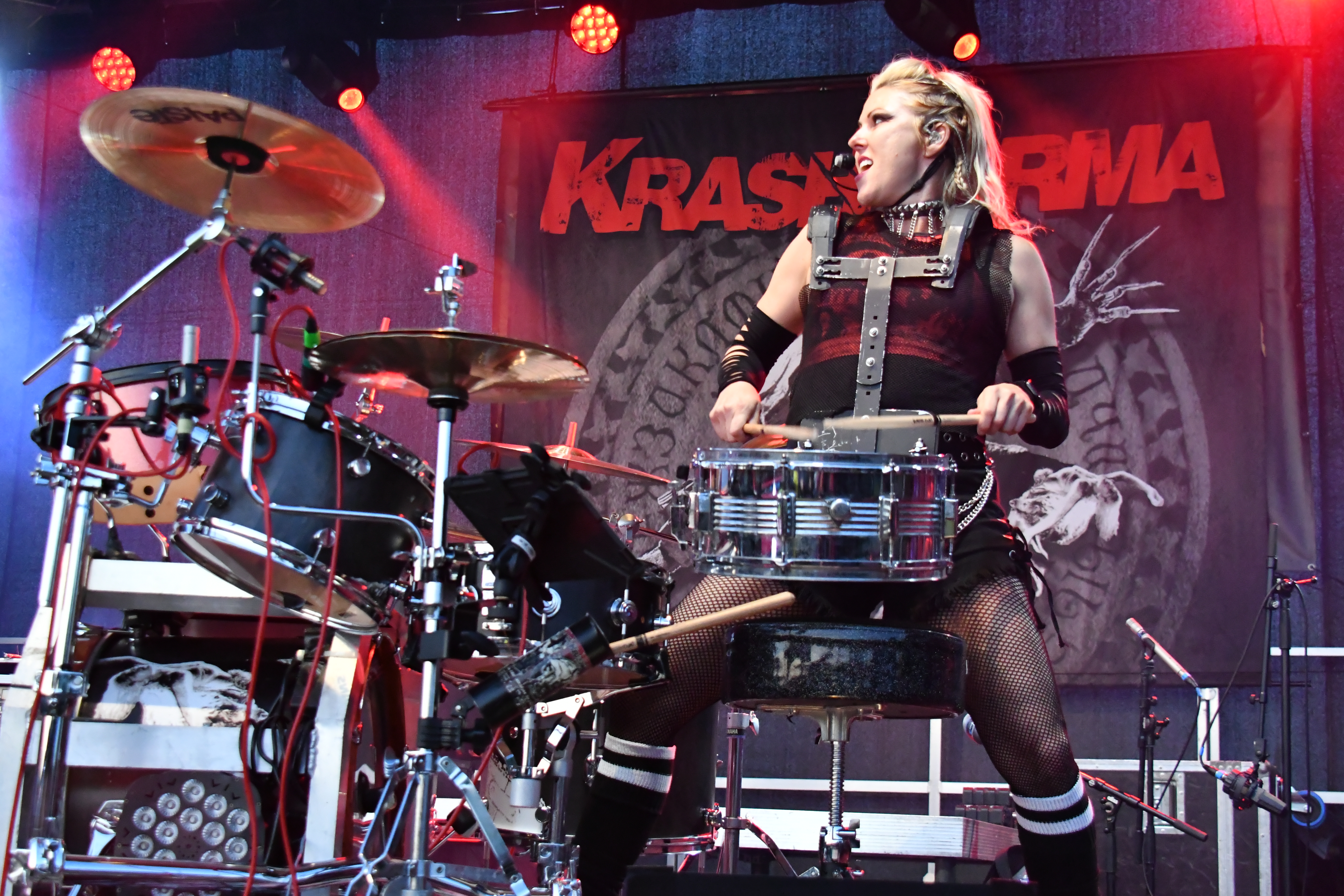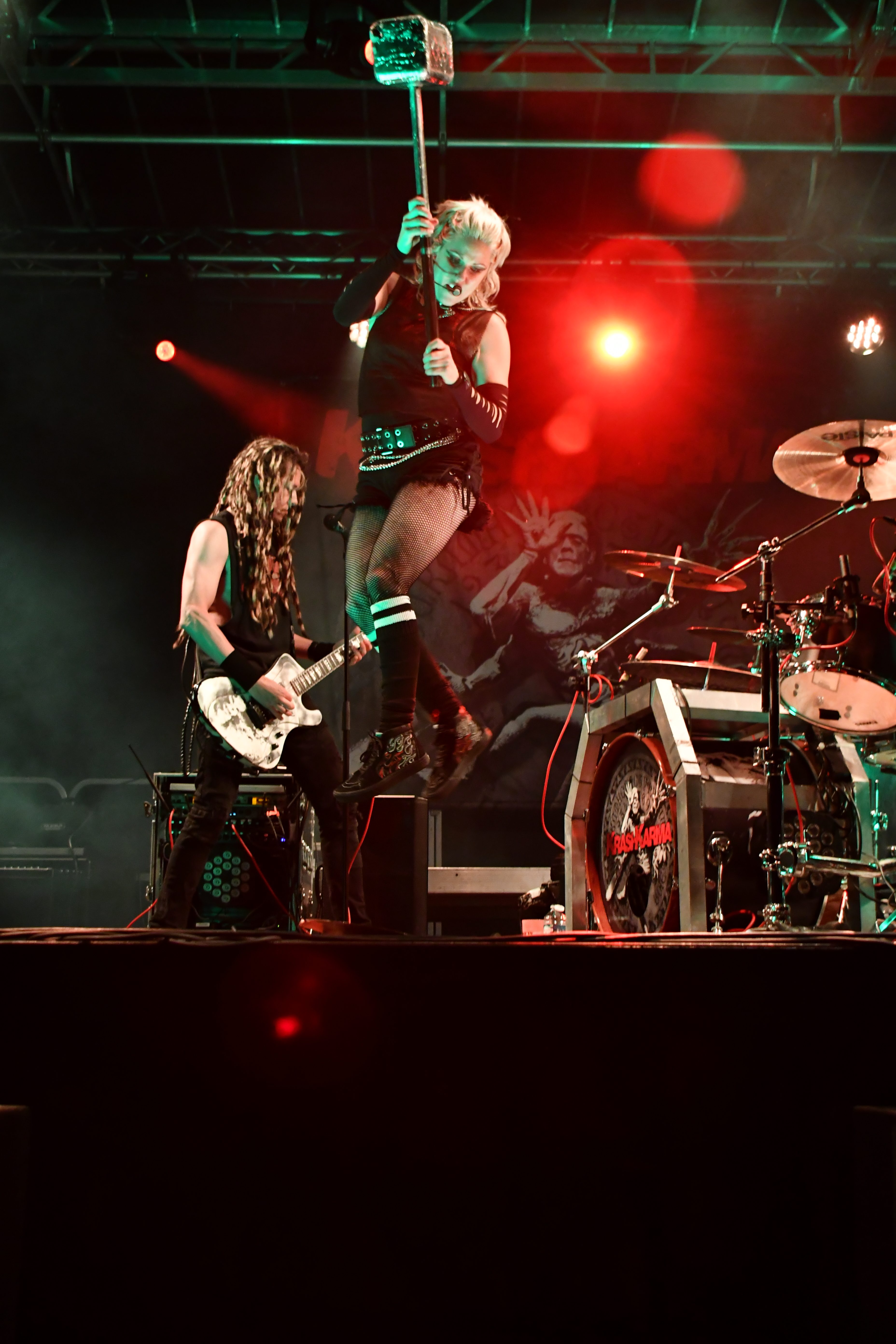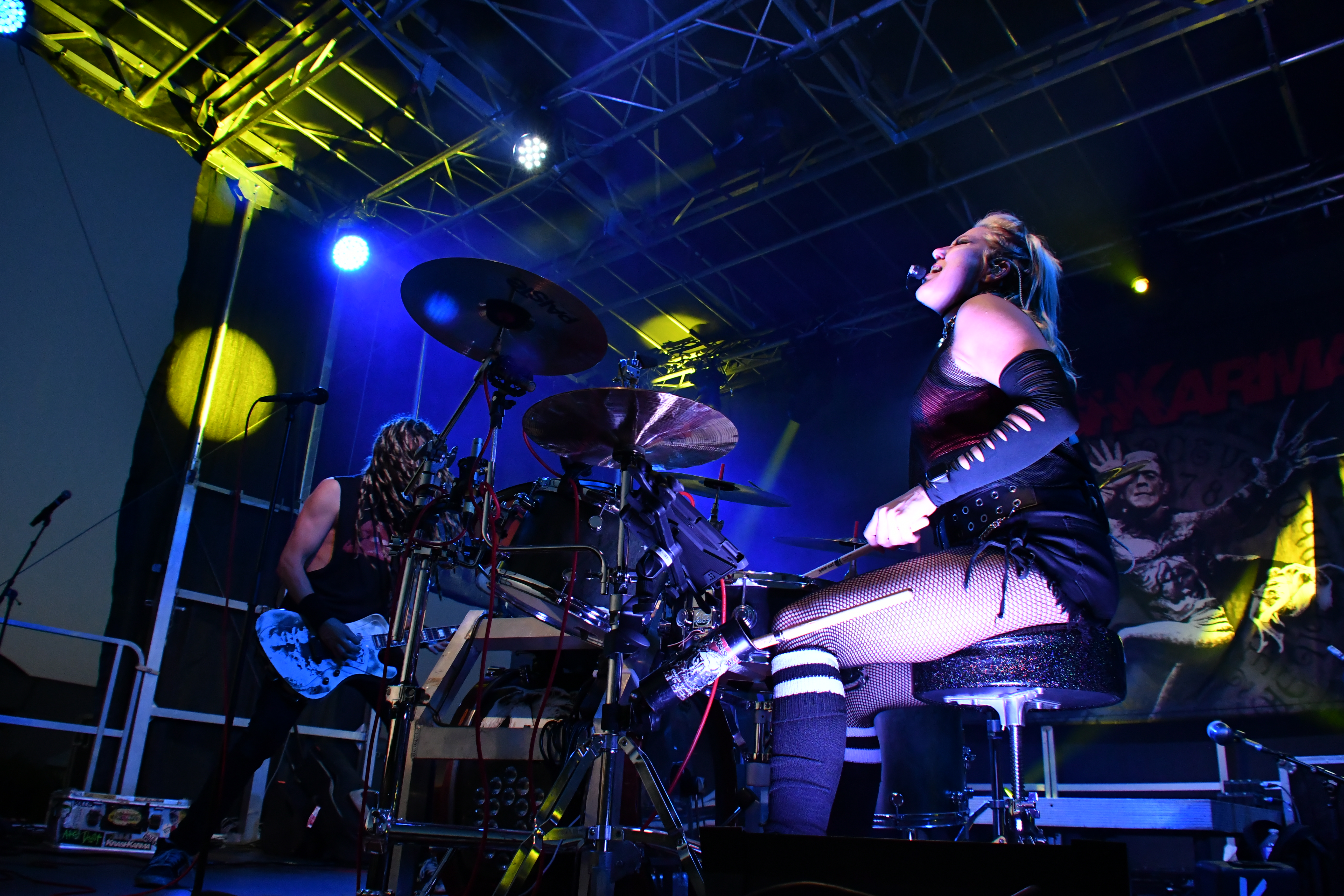 Encore peu connu en France, KrashKarma va se révéler LA sensation du festival. Le groupe m’ayant mis l’eau à la bouche au cours d’une interview quasiment improvisée (je leur ai demandé le matin même et obtenu un OK quasi immédiat, interview à découvrir avec ce lien), impossible de ne pas aller découvrir en live ce duo de L.A. composé de la batteuse chanteuse Niki et du bassiste/guitariste (tout ensemble, oui)/hurleur, Ralf. Un duo « belle et la bête » dont on ne sait pas vraiment qui est la belle et qui est la bête…