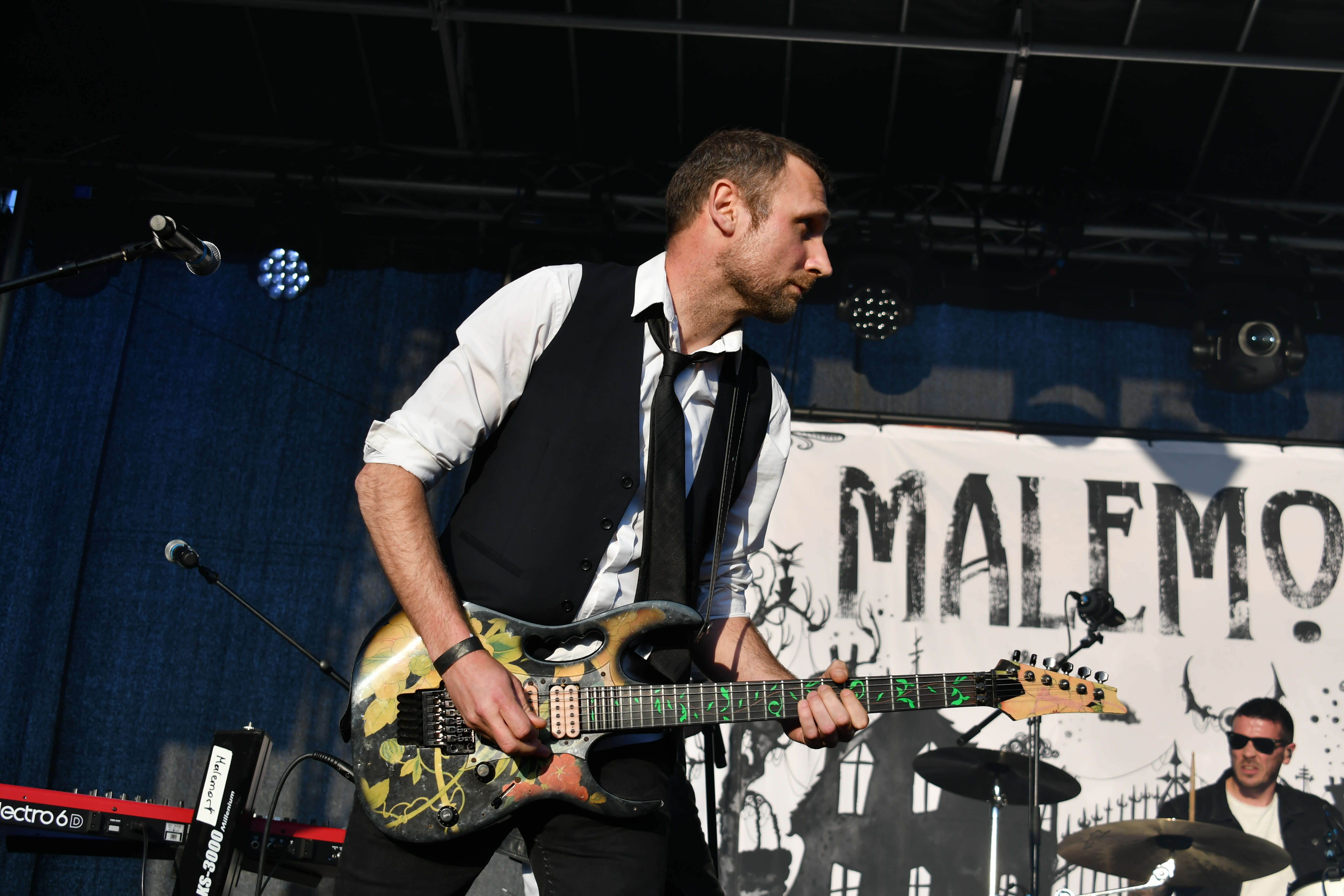Nous l’avons évoqué, Malemort revient enfin sur scène. Xavier, le chanteur, nous l’expliquait lors de la promo de Château Chimères, (cf. l’interview avec ce lien) le groupe a été remanié ne conservant en son sein que les deux Sébastien aux guitares et lui, ayant alors déjà une idée de quelle section rythmique les accompagnerait live. Le public va pouvoir découvrir cet après midi Romain – déjà connu pour son travail avec Bukowski – mais aura la surprise de voir un quatuor, le bassiste s’étant blessé au poignet et ne pouvant être de la partie. Xavier le notera d’ailleurs expliquant que le groupe joue aujourd’hui avec des basses préenregistrées. Un sacré exercice de précision qui explique sans doute que Malemort ne joue que 40′.