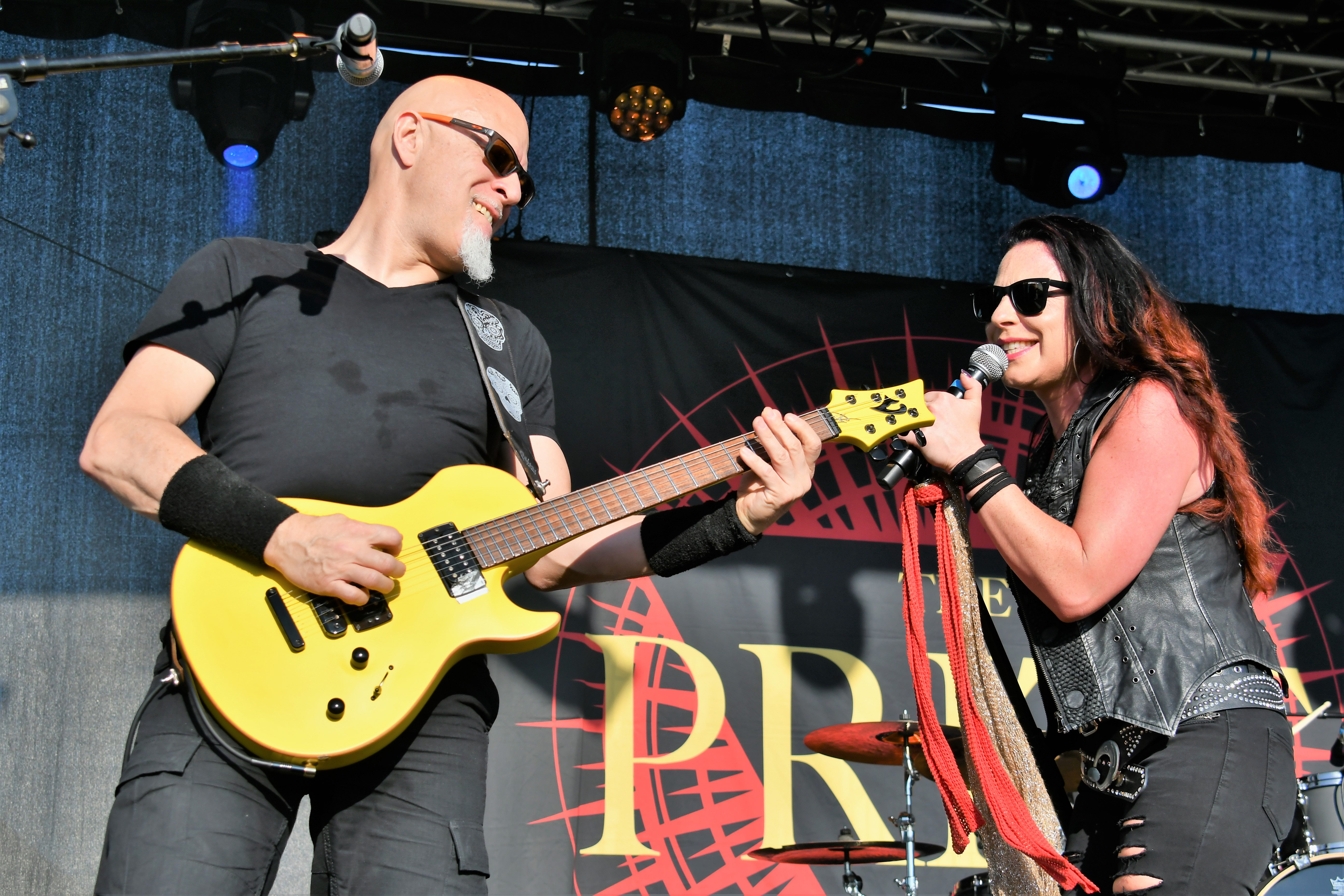 Ce vendredi débute avec The Prize, groupe récemment formé par le guitariste frapadingue Christophe Godin, son complice de Mörgbl, le batteur Aurel, et l’ex-chanteuse, première chanteuse d’ailleurs, de Nightmare, Maggy Luyten. Pendant une heure, le groupe nous offre un heavy metal varié et puissant, Maggy allant chercher le public là où il se trouve, assis sur les bancs à siroter des bières.